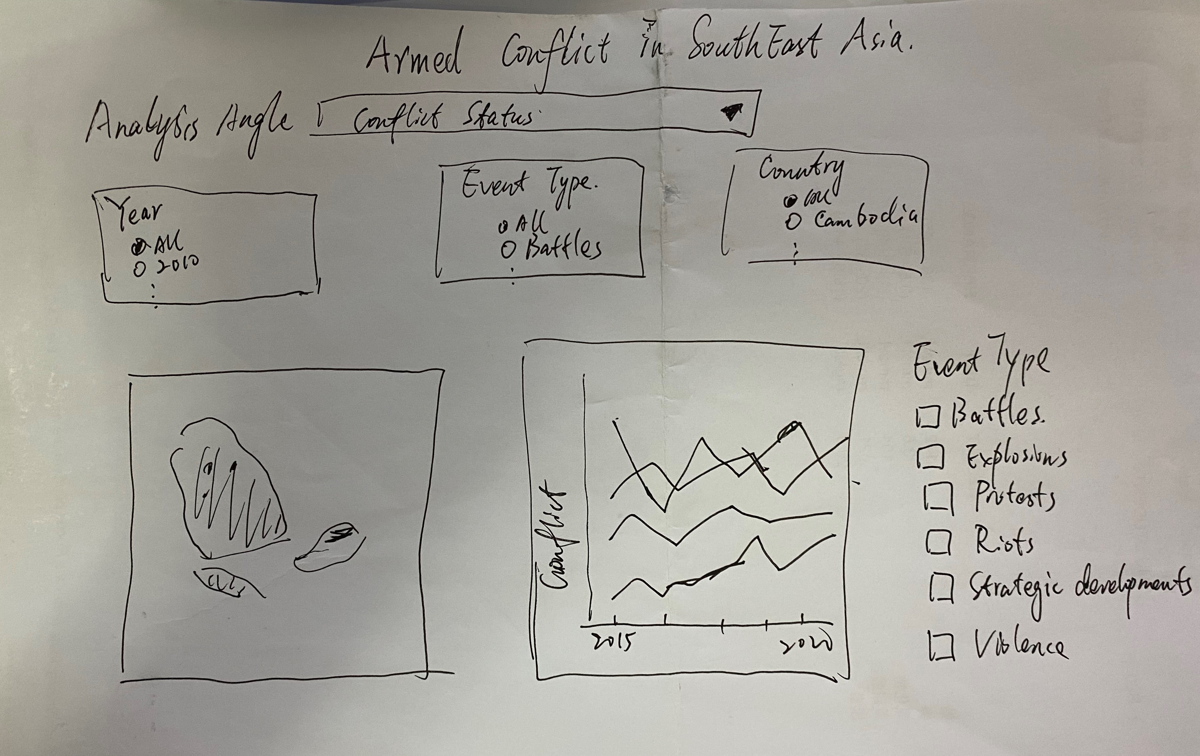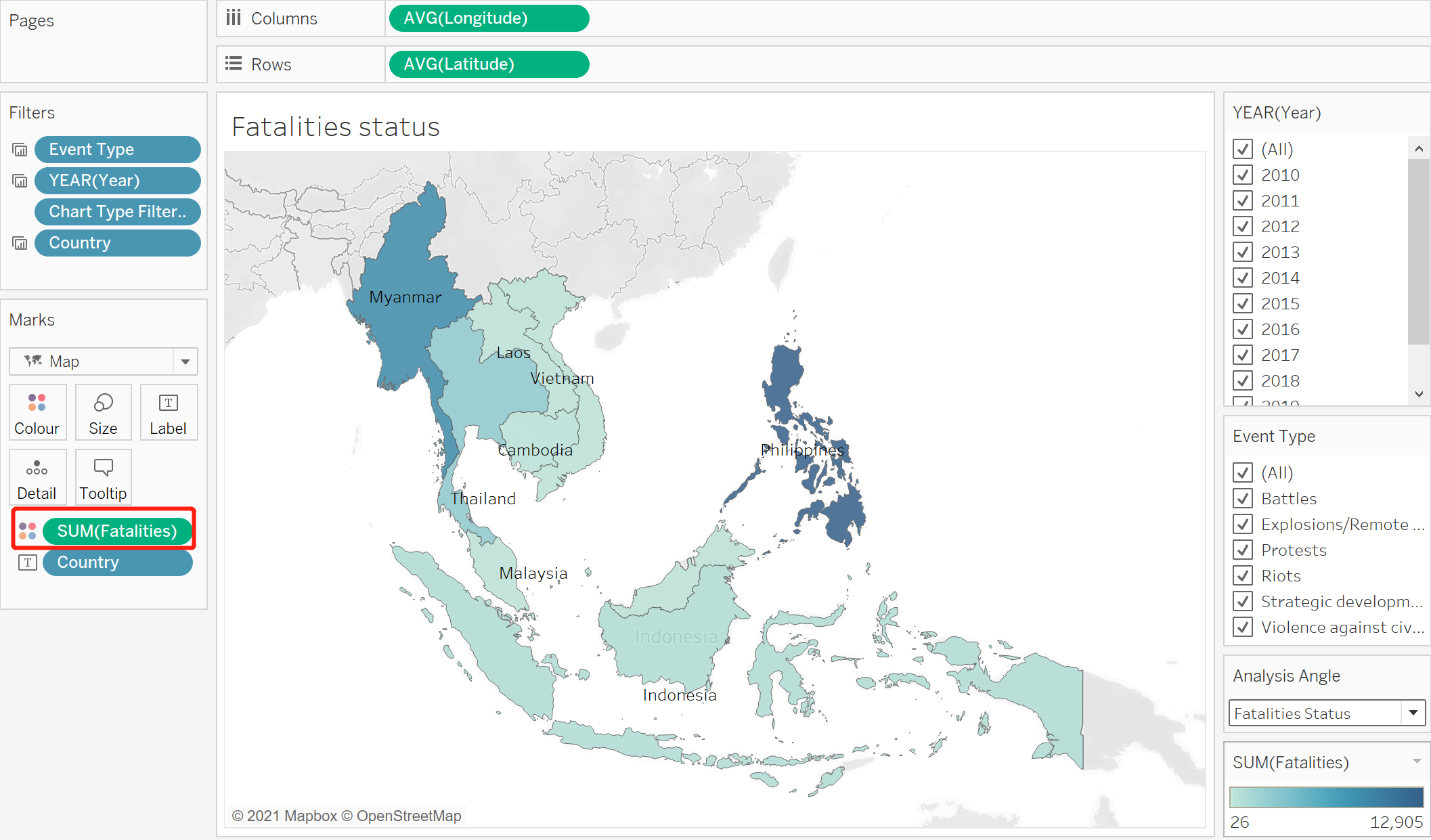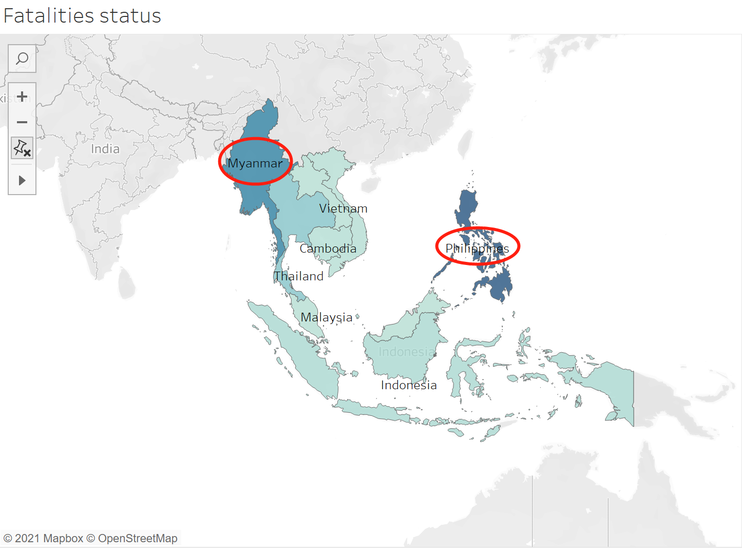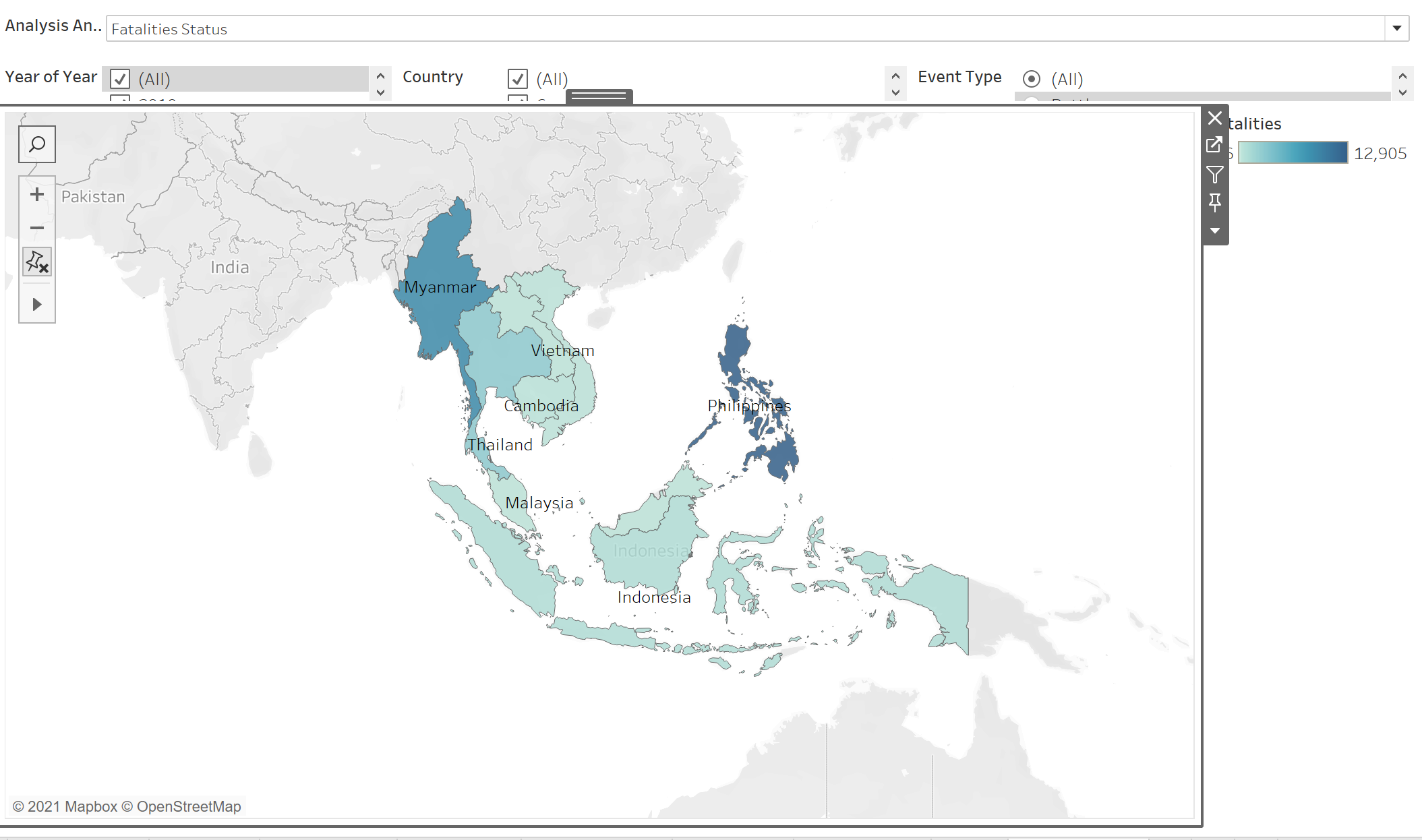 As we can see from the Conflict Status map, Myanmar has the Heaviest color in SouthEast Asia between 2015-2020. Besides, battles account for the largest proportion of them from the bar below.