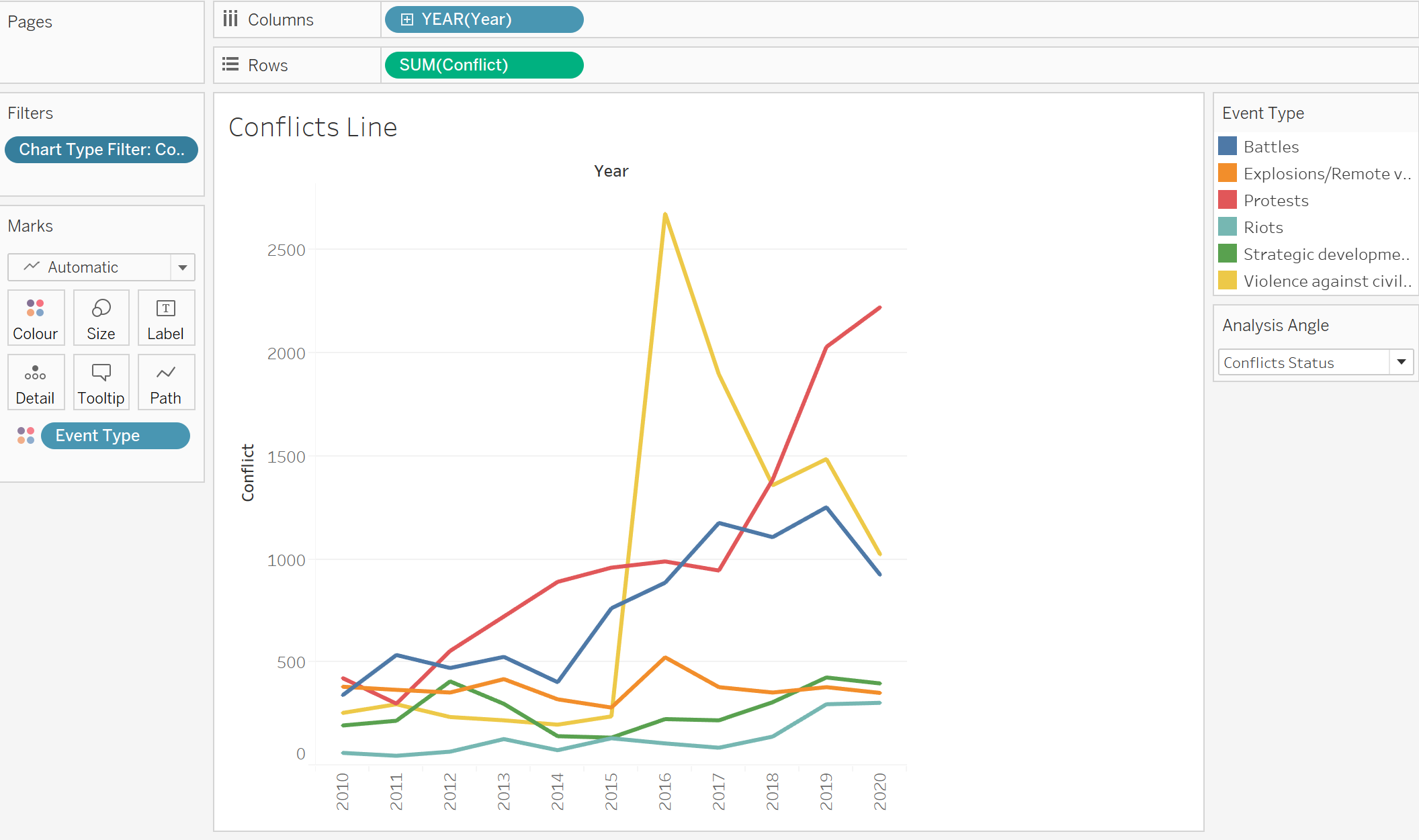 The scale of the y-axis of these charts are not synchronised under different event. Besides, the y-axis tick marks are of varying scale for Armed Conflict Event by Type. Should the user miss to notice this, the user will be comparing the event counts and trends incorrectly.